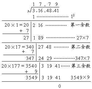 Solution The first step , the first number is the square root of the decimal point to the left and right position every two comma "," segments, such as the number 316.4841 segmented into 3,16.48,41 . second step, find the first Manufacturers of digital the initial period, so that the beginning of the first stage does not exceed the square's number, and the beginning of the provider plus a square of the first segment is greater than the number, this number is the first paragraph of Example 3 , provided for the beginning of 1 , because the 1 2 = 1 <3 , and (1 + 1) 2 = 4> 3 . third step, by subtracting the square of the first stage's digital First and second digital moved down, the remainder consisting of the first, in the present Examples of the first remainder 216 . fourth step, try to find providers, so (20 ' early commercial + test providers ) ' test provider does not exceed the first remainder, while [20 ' early commercial + ( test provider +1 )] ' ( test provider +1) is greater than the first remainder . fifth step, the first remainder minus (20 ' early commercial + test providers ) ' test providers, and move under the third paragraph numbers, the composition of the first Second remainder, in this case the test provider for seven , the second remainder is 2748 . shall thereafter continue to do so until all of the sections of the shift, if the last remainder is zero, the root operation ended . If the remainder is never zero, you can only take a certain precision approximation . sixth step, set the decimal point position, the position of the square root of the decimal point should be aligned with the square root of the number of decimal point position . this example formula is as follows: