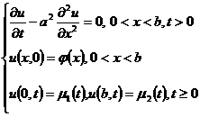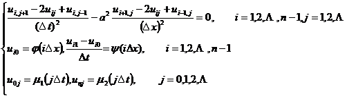由此可按t增加的方向逐排求解.在第0排上ui0的值由初值(ix)确定,j+1排ui,j+1的值可由第j排的三点(i+1,j),(i,j),(i-1,j)上的值ui+1,j, uij,ui-1,j确定,而u0,j+1,un,j+1已由边界条件1((j+1)t)及2((j+1)t)给定,于是可逐排计算一切节点上的uij值.当(x), 1(x)和2(x)充分光滑,且