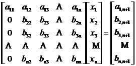 ( 2 ) Find the main element in the coefficient matrix except for the first row . Let b 22 be the main element . Then multiply the second equation by the ith equation and add them respectively ( i=3,4,. .. n ), to obtain a new system of n -order linear equations, represented by a matrix as follows![]()