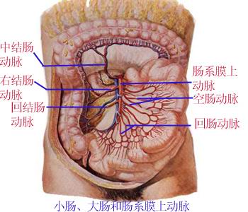 主要分支:空肠动脉、回肠动脉、回结肠动脉→阑尾动脉、右结肠动脉、中结肠动脉等。