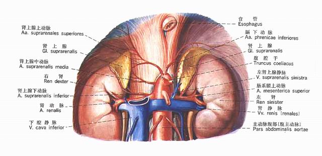 肾上腺位于左、右肾的上端,与肾一起包被在肾筋膜内。