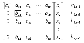 2)在除第1行外的系数矩阵中找出主元素,不妨设b22为主元素.再将第二个方程乘以分别与第i个方程相加(i=3,4,...n),得到新的n阶线性方程组,用矩阵表示如下