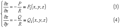 设完全可积条件(2)成立.为了构造积分曲面,把z看成x,y的函数(设R(x,y,z)≠0),于是原方程化为