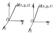 Ox为横轴,Oy为纵轴,Oz为竖轴 M(x, y, z) x为横坐标 y为纵坐标 z为竖坐标 I~VIII为八个卦限,在各个卦限里点的坐标x, y, z的符号为 |
