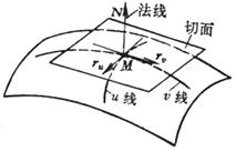 [法线单位矢量] 通过曲面上一的M所有曲面曲线(即该曲面上的曲线),在点M的切线落在同一平面上(奇点除外),称这平面为曲面在点M的切面通过点M与切面垂直的直线称为曲面在点M的法线.