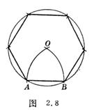 [已知边长作正六边形] 已知AB等于边长,分别以A,B为圆心,AB为半径画弧交于O,以O为圆心,AB为半径画圆.再按上法可作出所求正六边形(图2.8).