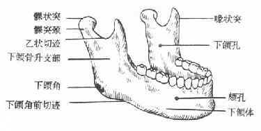 下颌骨分为体部及升支部,两侧体部在正中联合。下颌升支部上方有两个骨性突起,在后方者称为髁状突,在前方者称为喙突(肌突),两者之间的凹缘称为乙状切迹。升支部后缘与下颌骨下缘相交处称为下颌角,升支部内侧面中部有一个孔称下颌孔,此孔在下颌骨内向下向前延伸的管道,称下颌骨。下颌管在第一、第二前磨牙牙根之间向外穿出一孔,称颏孔。下牙槽神经、血管从下颌孔进入下颌管向前走行,在颏孔处分出颏神经及血管(图1-12)。