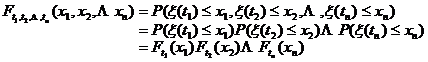 [ Finite-dimensional distribution function family of random processes ]   Let { x ( t ) , t Î T } be a random process, for any positive integer n and any t 1 , t 2 , L , t n Î T , random variables The joint distribution function of x ( t 1 ) , x ( t 2 ) , L , and x ( t n ) is
